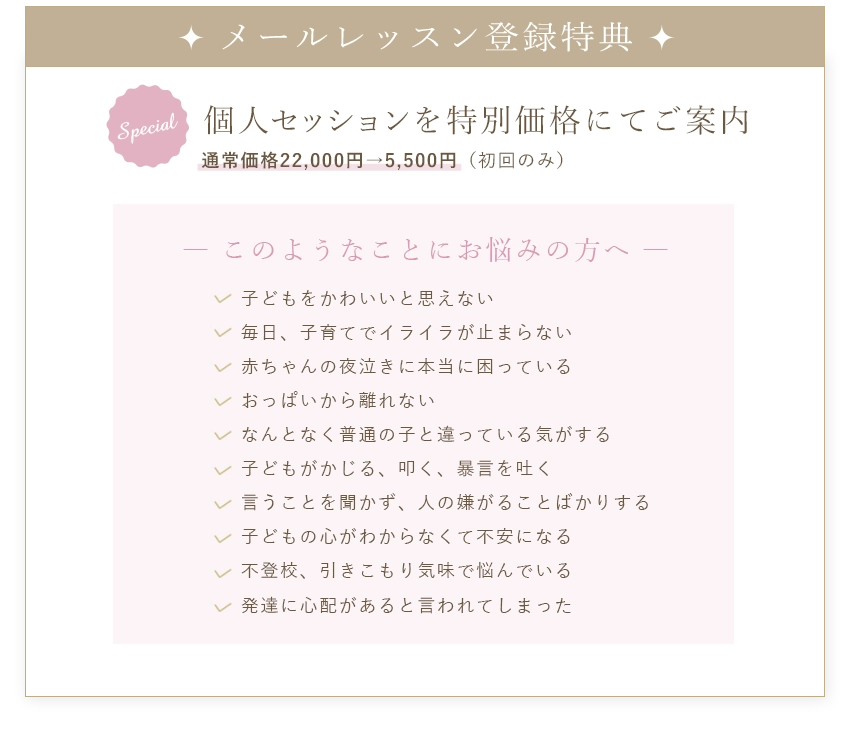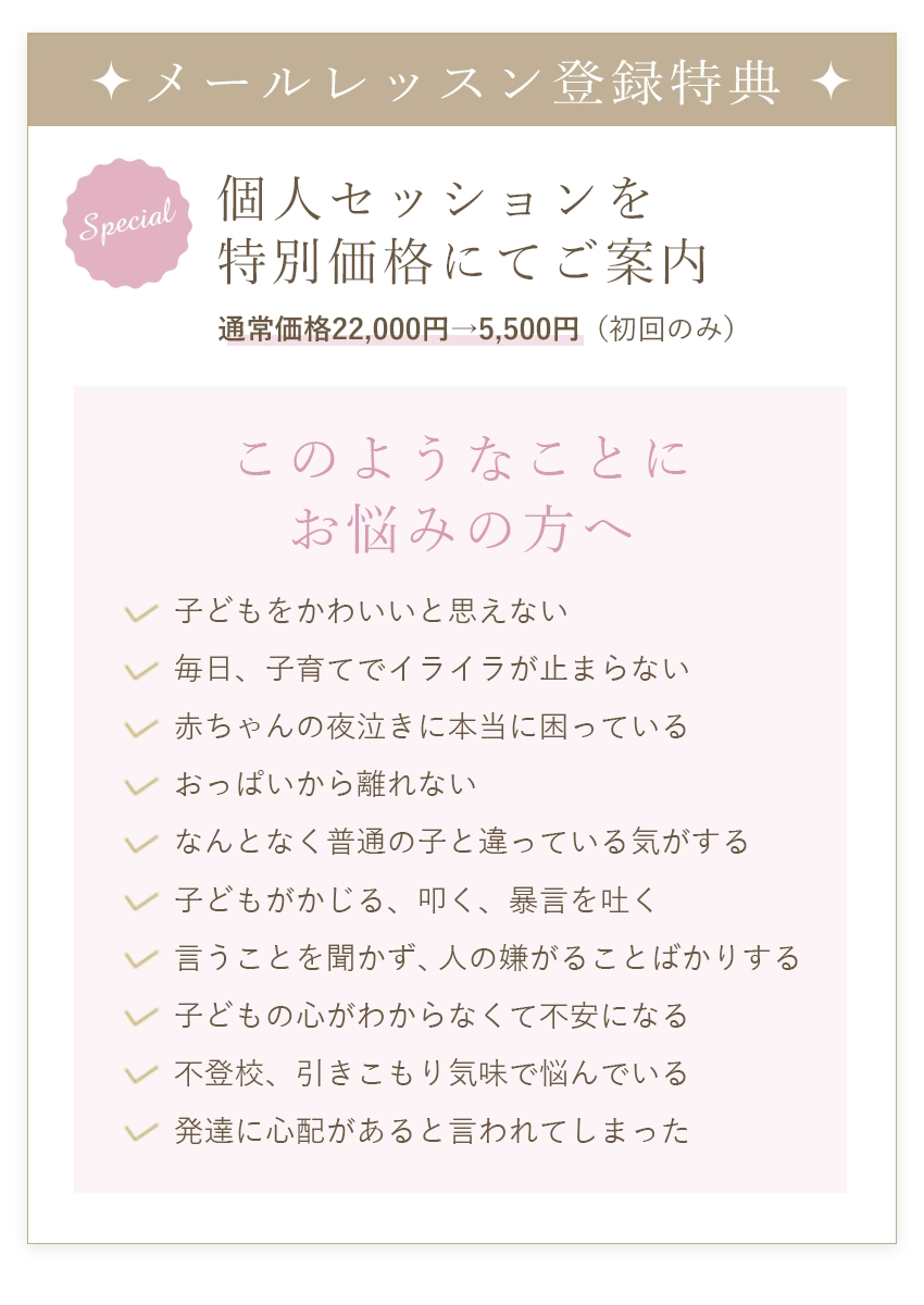 どうしても娘が可愛いと思えず、ヒステリックに怒る自分も嫌いで、解決策が無いかと探していた時に恵さんに出会いました。あんなに子育てに悩んでいたのが嘘のように現実が変わり、実母との関係も良くなり、今は自分の趣味を仕事にして毎日が楽しいです!